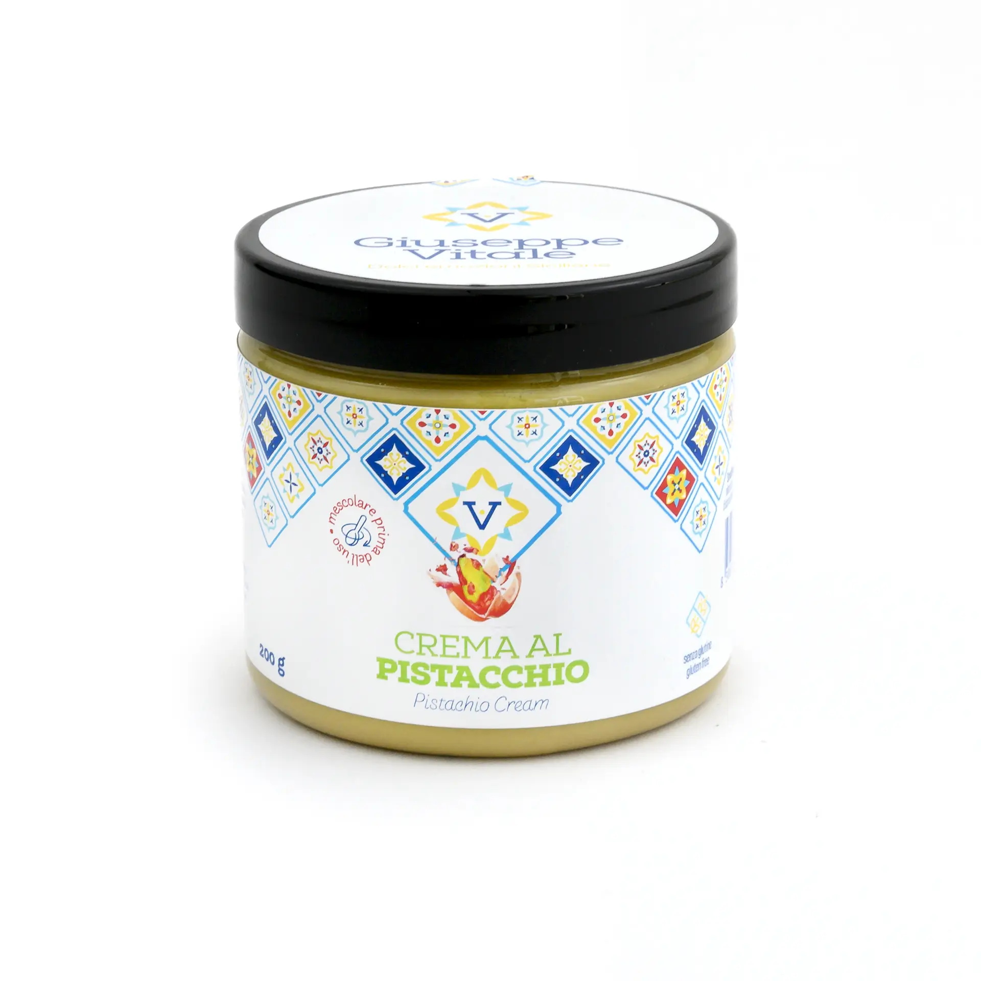 Crema bianca [zucchero, oli e grassi vegetali (oli di girasole, grassi: palma, palmisti), LATTE scremato in polvere (10%), siero di LATTE in polvere, emulsionante (lecitina di girasole), aroma (vanillina)], PISTACCHIO 35%